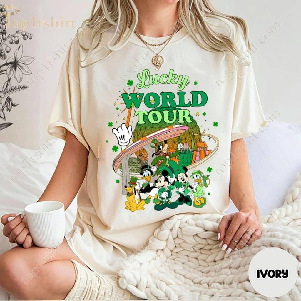 The shirt showcases an eye-catching design featuring Mickey Mouse and his closest friends, including Minnie Mouse, Donald Duck, Goofy, and Pluto, all adorned in vibrant St. Patrick's Day attire. The characters are depicted with playful expressions, surrounded by classic symbols of the holiday such as shamrocks, pots of gold, and rainbows. The design is printed on a high-quality fabric using advanced printing techniques, ensuring that the colors remain vivid and the details sharp wash after wash.
